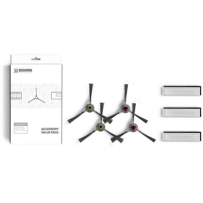 De DEEBOT Accessoire Kit DA60-KTA van Ecovacs bevat alle accessoires om de DEEBOT SLIM / SLIM2 voor ongeveer een jaar te onderhouden, zonder extra aankopen. Deze Robotics Accessoire-set voor DEEBOT bestaat uit een vier zijborstels en drie filters (spons + fijnstoffilter). De originele accessoires zorgen voor een langere levensduur en optimale prestaties van de robotstofzuiger.